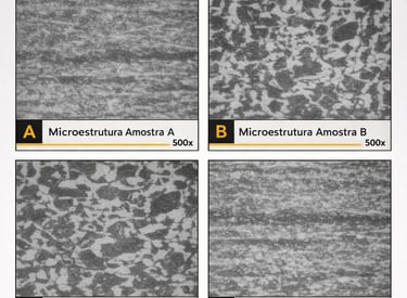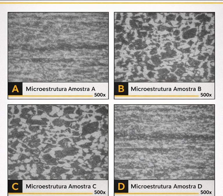 Análise metalográfica de amostras (A, B, C e D) com observação em microscopia óptica (500x), visando avaliar heterogeneidades microestruturais.